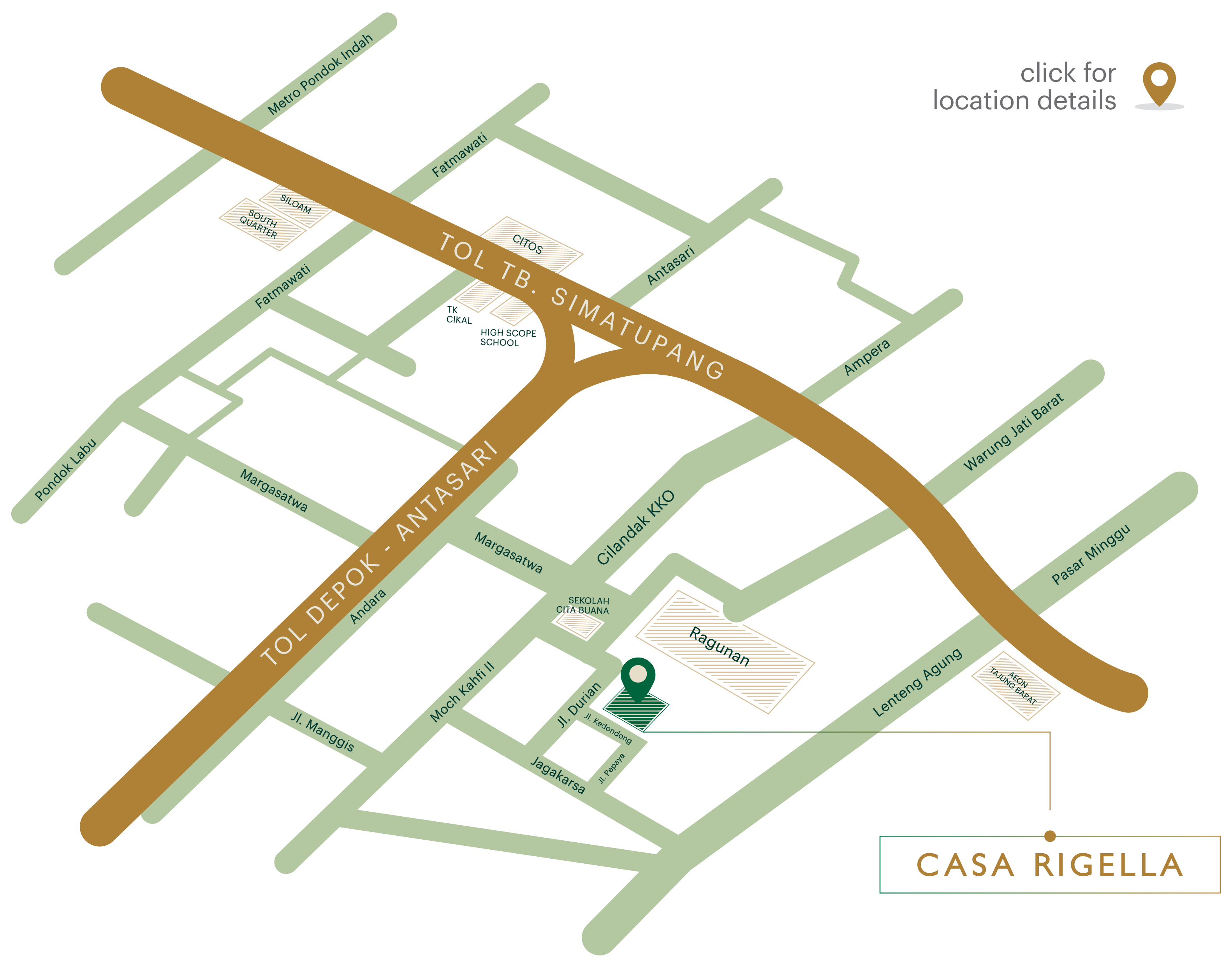 Casa Rigella Jagakarsa is even blessed with having a strategic location that allows easy access from many exciting lifestyle places and business districts in South Jakarta.Located close to the toll road (Depok - Antasari & Simatupang) make it possible to get anywhere very easily and avoid the worst traffic.